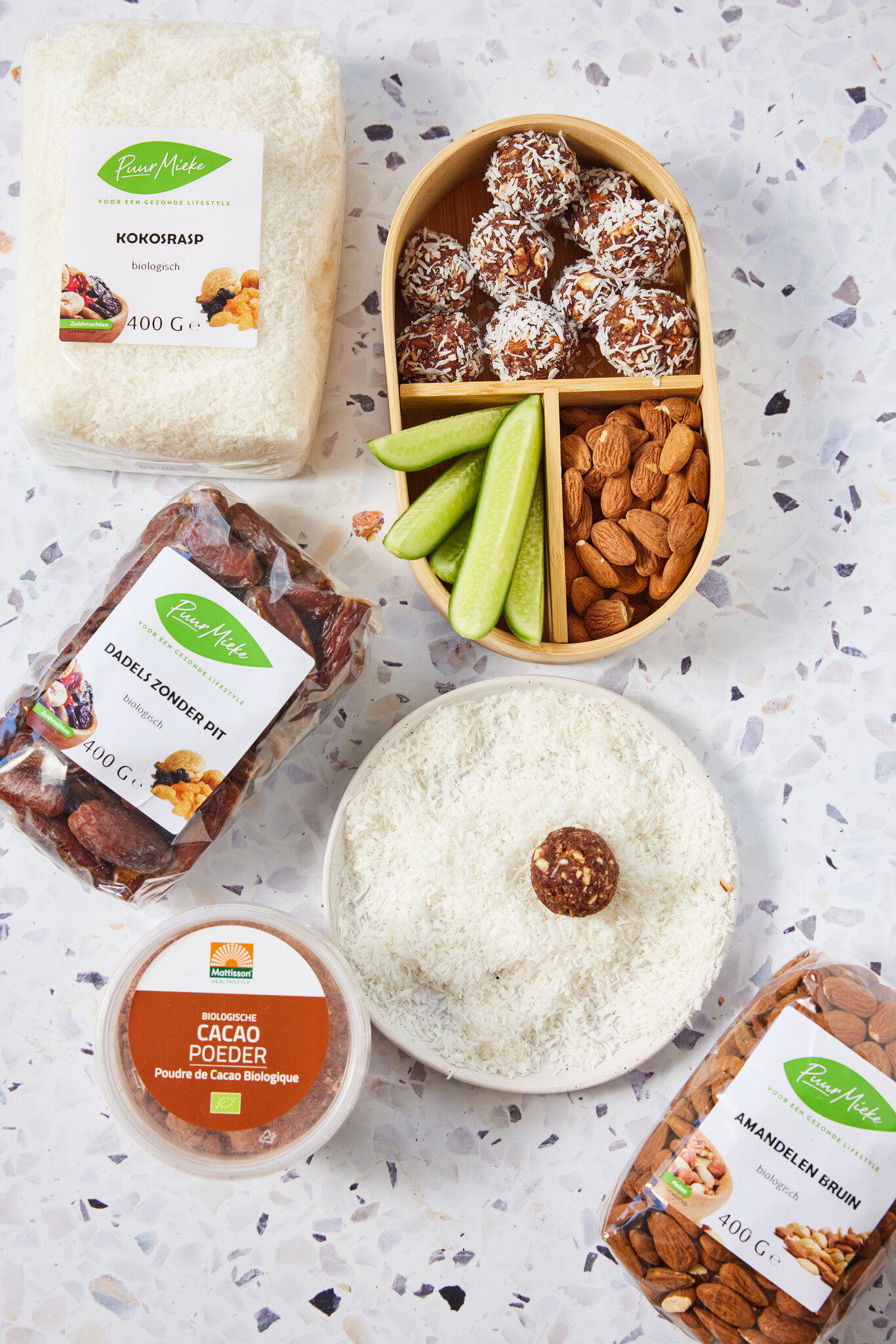 Rol nu balletjes van het mengsel en rol elk balletje door de kokosrasp.