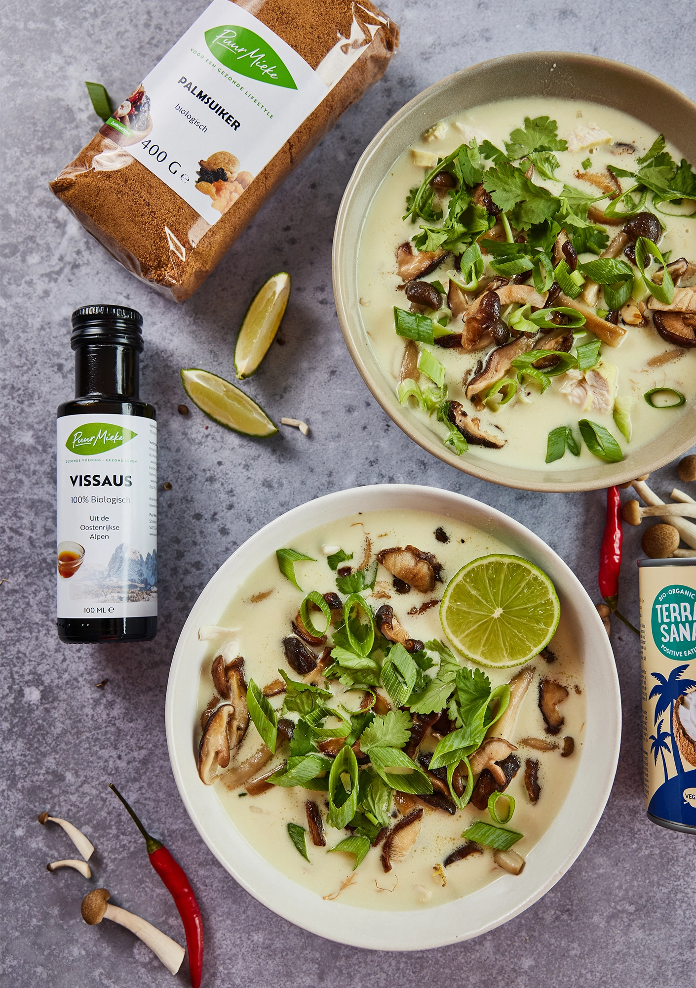 Tom Kha Kai is een romige Thaise kippensoep met kokosmelk, citroengras en galangal. Voor de authentieke smaak gebruiken we onze pure Puur Mieke Vissaus. In 30 minuten zet je een smaakvolle maaltijdsoep op tafel, afgemaakt met kip, paddenstoelen en verse koriander.