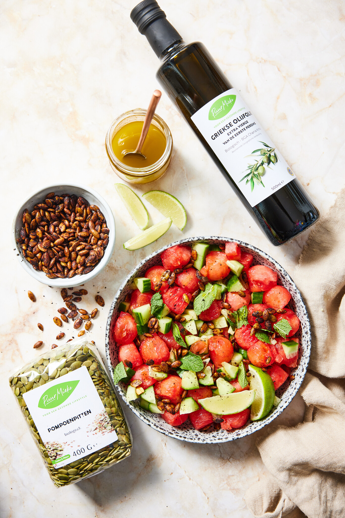 Frisse salade met watermeloen, komkommer en gekruide pompoenpitten. Makkelijk, zomers en vol smaak. Perfect voor lunch of bijgerecht.