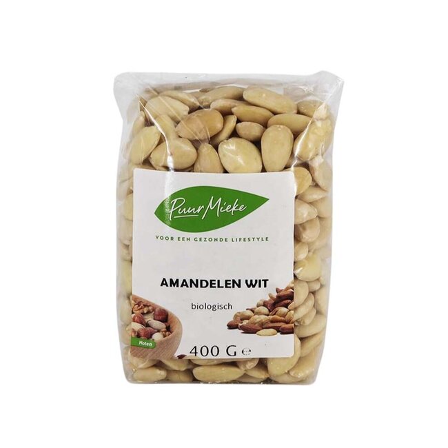 Amandelen zijn een van de meest gegeten noten. Geen wonder ook want ze zijn onwijs lekker. Omdat deze noten zo lekker zijn mogen ze natuurlijk niet ontbreken in onze eigen pure lijn. De witte amandelen zijn geblancheerd om het velletje te verwijderen en ongezouten zodat je er direct van kan genieten. Ze zijn nĂ©t wat zachter van structuur en smaak om te eten. Amandelen groeien aan de amandelboom (Prunus dulcis). Als de amandelen aan de boom groeien zit er een niet eetbare schil om het nootje. Om bij de amandelen te komen moet eerst de schil gekraakt worden. Deze amandelen zijn puur natuur. Â